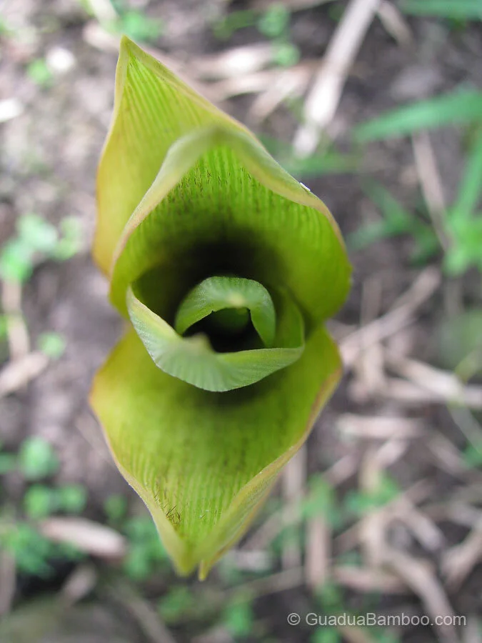 This species is a small sized graceful bamboo. Culms are loosely tufted, dark shiny green, woody and thick-walled, with an average height between 2-5 m. Internodes are 10-15 cm long of which the lower internodes are shortened and swollen with nodal roots. Lower swollen internodes can be 10-12 cm in diameter.