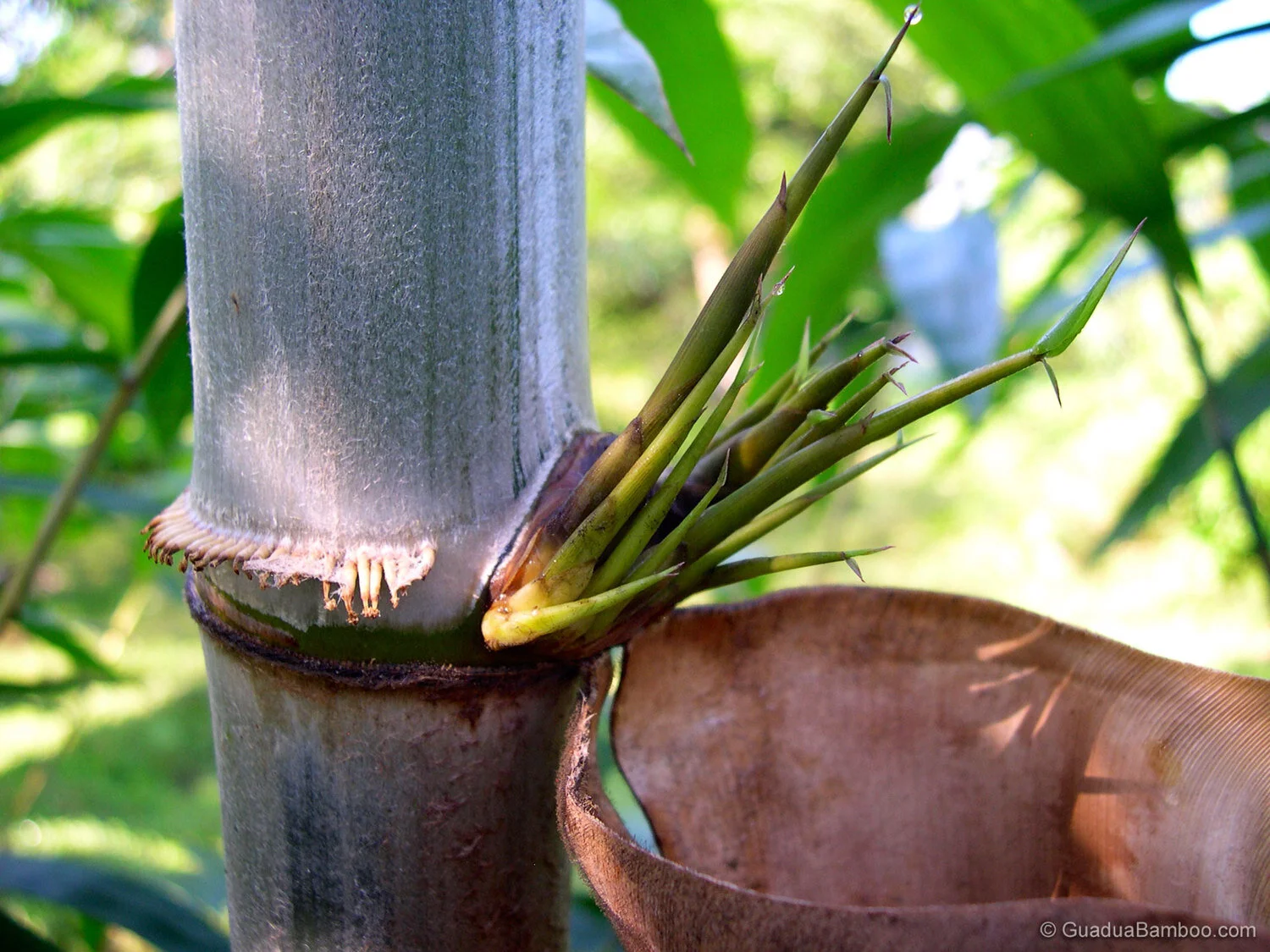 Dendrocalamus brandisii is a very large evergreen tufted bamboo. Culms have an ashy-gray to greenish-gray color and are on average between 19-33 m high and 13-20 cm diameter. The thick walled internodes are between 30-38 cm long. Nodes are slightly swollen with rootlets showing on the lowest nodes. Young shoots are dark-gray with a dark-brown blade.