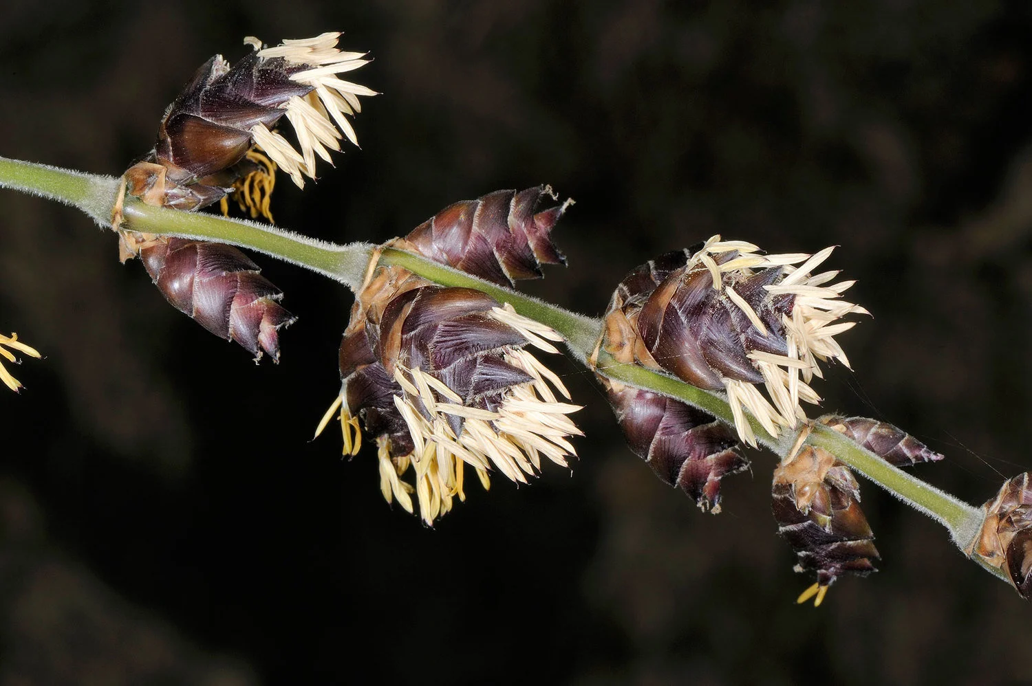 Many clustered branches with 1 larger dominant branch. Branches usually start occurring near the middle of the culm.