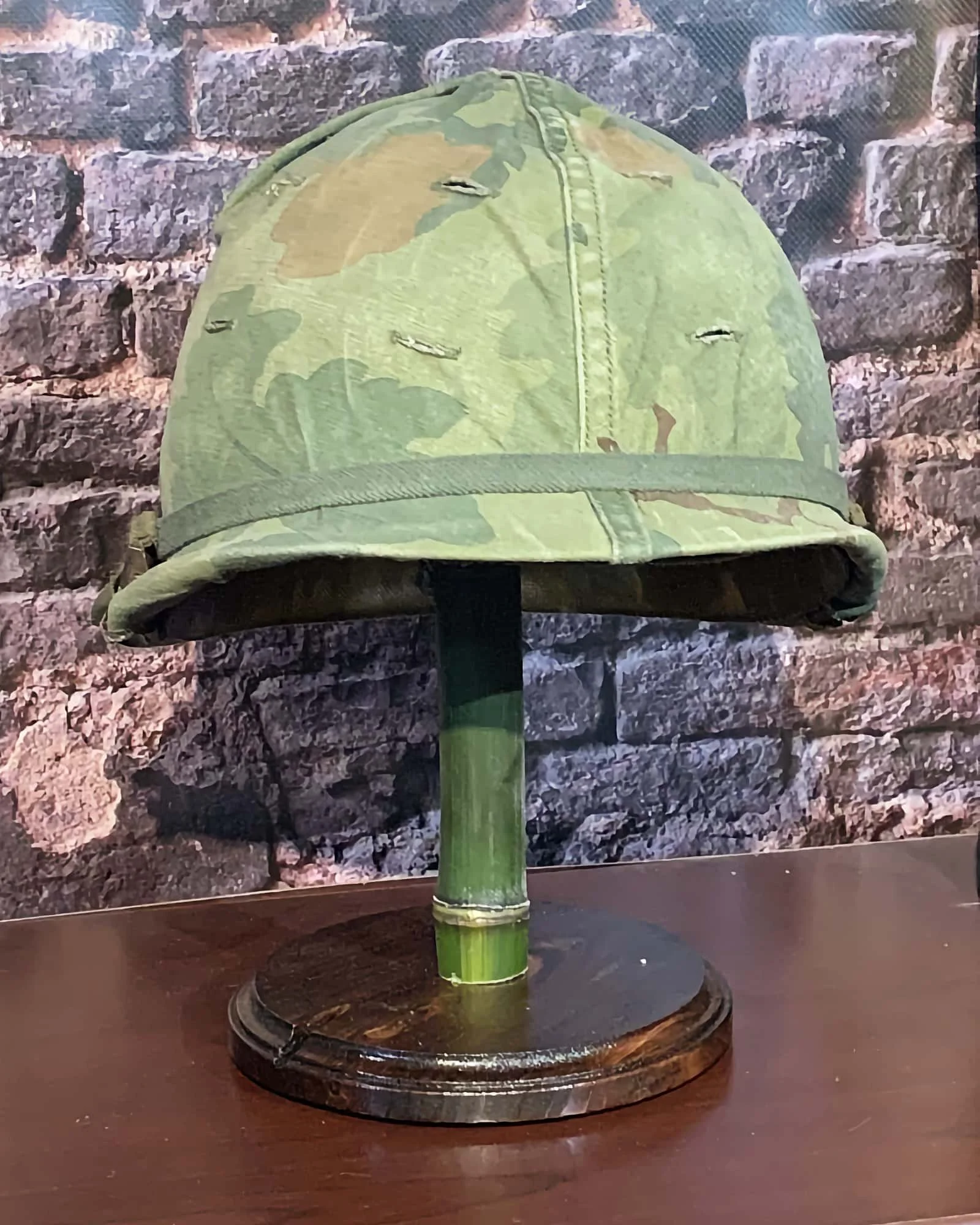 I make Helmet stands for Collectors of Militaria. The US M1 helmet is very popular when used with the Camoflage helmet Cover used in the Vietnam War. I recently had access to freshly cut bamboo and used it on the display. It was well received and I was asked if it was avaialble.