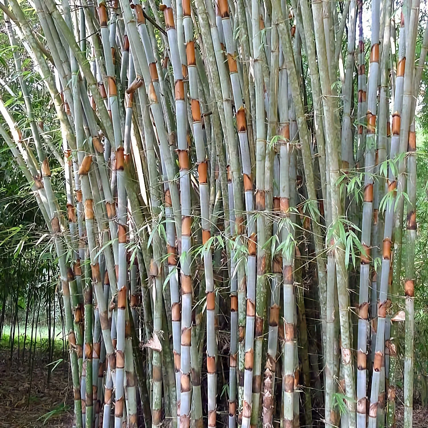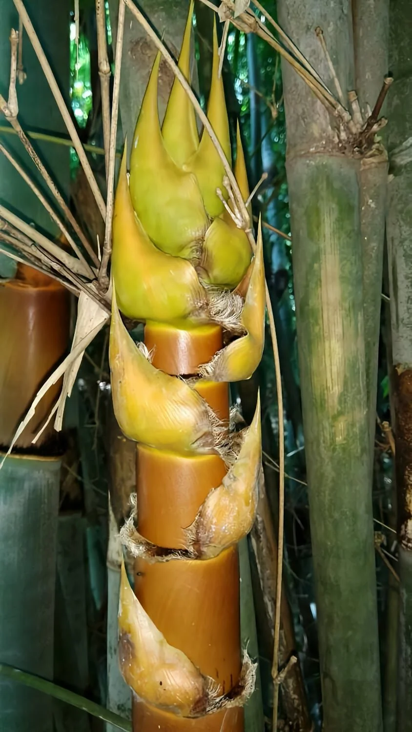 The color of the culms is bluish-green (somewhat whitish below the nodes when young), and greyish-green when mature. Young shoots have an orange-yellow color.